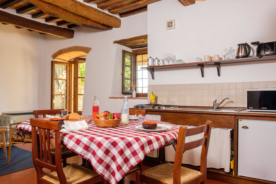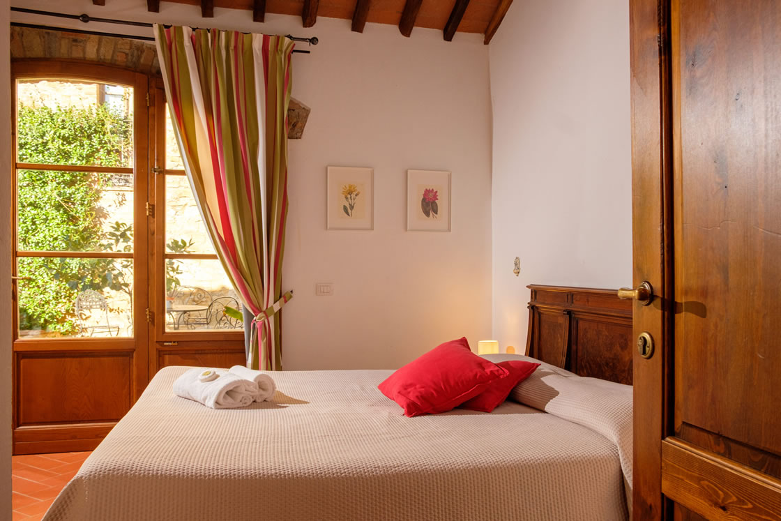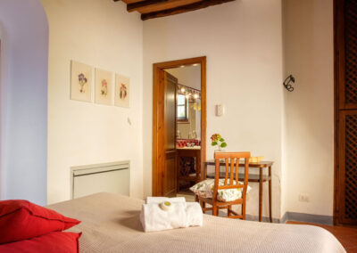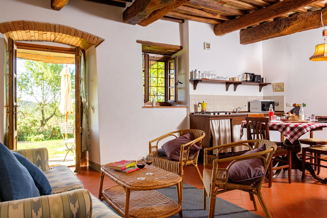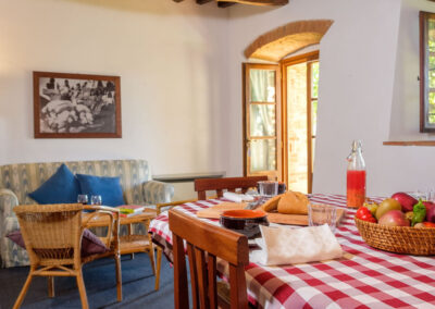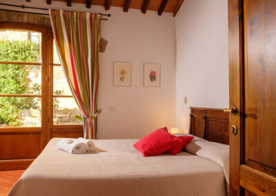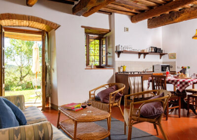 Lavanda 1 faces the main garden in Ticciaia farmhouse. The apartment is on one floor with a surface of 63 square metres and includes: a pleasant and large living area with kitchen corner and sofa bed, 1 large and elegant double bedroom with its private bathroom/shower and another double bedroom, 1 bathroom with shower. The apartment is equipped with air-conditioning. Apartment Lavanda 1 can be connected (through a double wooden door) with Lavanda 2 to form a suite able to comfortably host 6/8 people. Apartment is equipped with autonomous air conditioning.